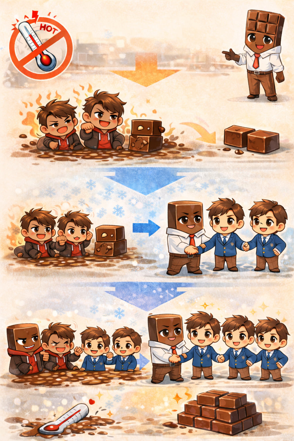 そこで全体を冷やし始めると真面目に固まろうという勢力が増えてきて、さらに冷やすと全員は一致団結して固まる勢いを増しますが、そのまま固まられると作業ができないので、軽く温めて一部を不良少年化させます。
